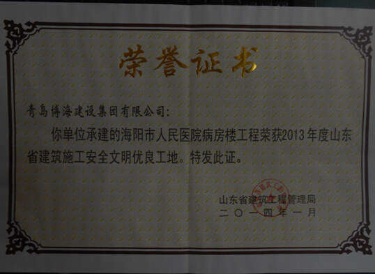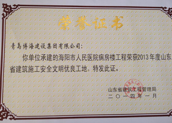 2013年山東省安全文明優(yōu)良工地-海陽(yáng)人民醫(yī)院