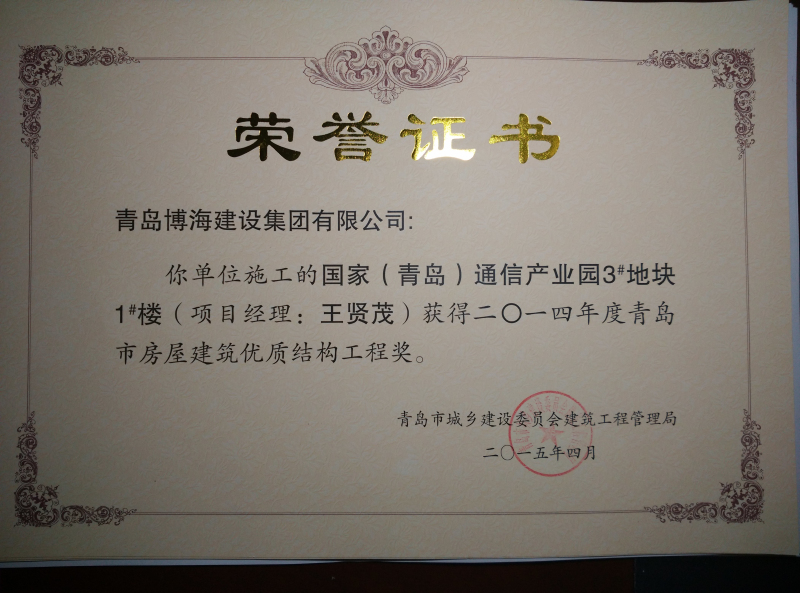 2014年青島市優(yōu)質(zhì)結(jié)構(gòu)-通信產(chǎn)業(yè)園3#地塊1#樓