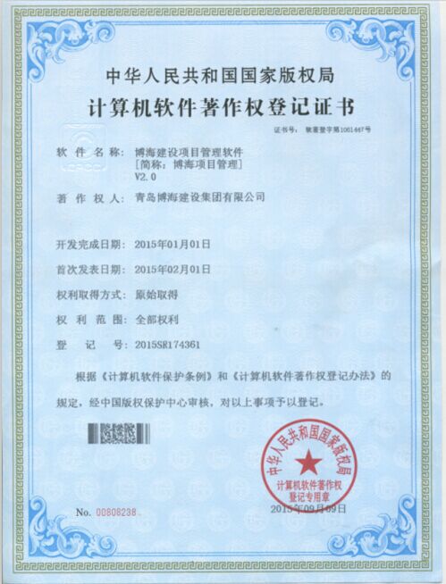 經(jīng)國家版權(quán)局考證,根據(jù)《中華人民共和國計(jì)算機(jī)軟件保護(hù)條例》和《計(jì)算機(jī)軟件著作權(quán)登記辦法》的規(guī)定,近日,青島博海建設(shè)集團(tuán)有限公司的 “博海項(xiàng)目管理系統(tǒng)V1.0”認(rèn)定為軟件法定著作權(quán)人,并于2015年9月19日被正式授予《中華人民共和國國家版權(quán)局計(jì)算機(jī)軟件著作權(quán)登記證書》。即日起,該版權(quán)將得到“中國版權(quán)保護(hù)中心”的有效保護(hù)。 該證書的獲得,對博海建設(shè)集團(tuán)公司知識產(chǎn)權(quán)工作具有里程碑式的意義,它意味著博海建設(shè)自主研發(fā)能力在具有獨(dú)立知識產(chǎn)權(quán)的項(xiàng)目管理領(lǐng)域得到了權(quán)威的認(rèn)可和充分的肯定,標(biāo)志著博海建設(shè)在軟件開發(fā)高新技術(shù)領(lǐng)域上邁上了一個新的臺階。